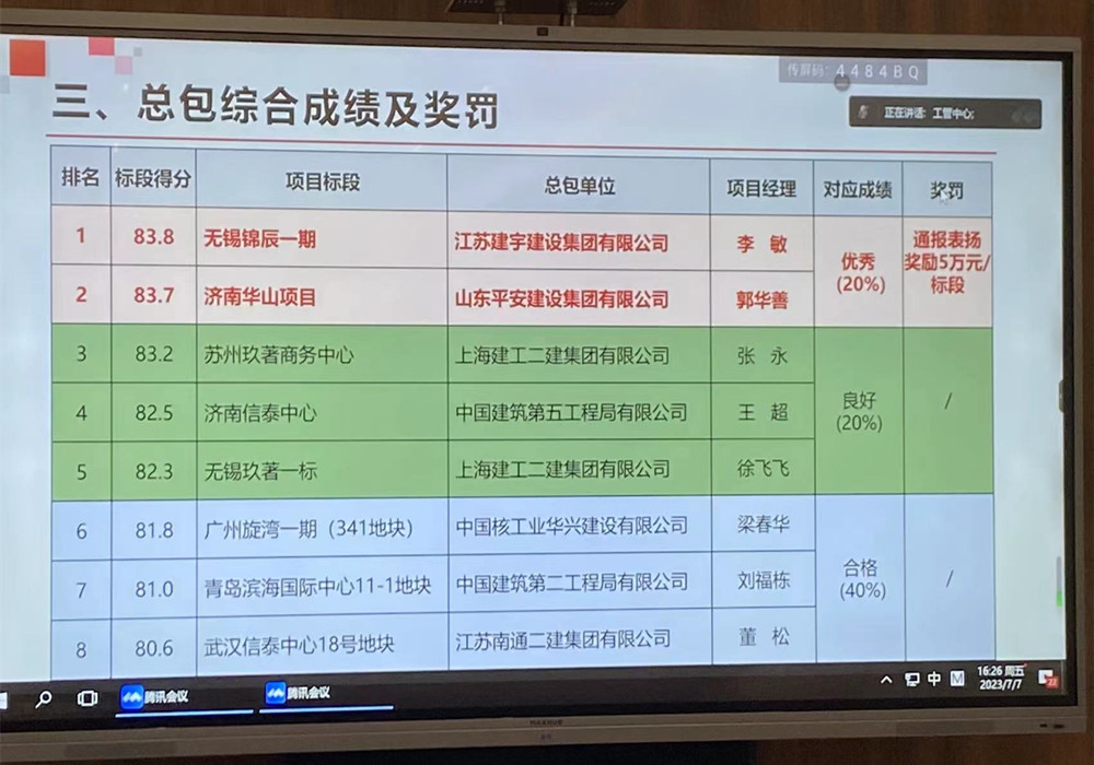 錦辰項(xiàng)目在中信泰富地產(chǎn)全國評比,多次取得較好成績,受到了主管部門、甲方、第三方咨詢機(jī)構(gòu)的好評。本次2023年第二輪工程評估中榮獲第一名的好成績,并獲獎(jiǎng)勵(lì)5萬元,又一次證明集團(tuán)綜合實(shí)力和項(xiàng)目管理能力。